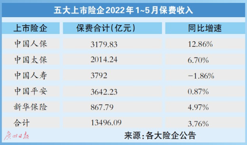 截至6月15日,A股包括中國人壽、中國平安、中國人保等在內(nèi)的五大上市險(xiǎn)企今年前5個(gè)月的保費(fèi)收入全部出爐,合計(jì)取得保費(fèi)收入約1.35萬億元,同比增長3.76%。