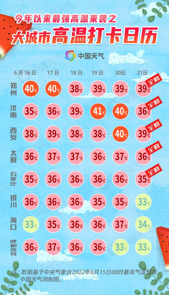 中國(guó)天氣網(wǎng)訊 今年以來最強(qiáng)高溫來襲!今(6月15日)起到22日,北方高溫強(qiáng)勢(shì)返場(chǎng),鄭州、濟(jì)南等地最高氣溫可達(dá)40℃或以上,部分地區(qū)高溫持續(xù)時(shí)間之長(zhǎng)、強(qiáng)度之強(qiáng)都是同期少見。中國(guó)天氣網(wǎng)推出大城市高溫打卡日歷,看哪些地方未來6天高溫全勤到崗。