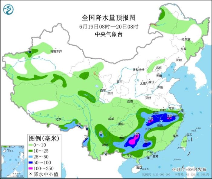6月19日08時至20日08時,江淮西南部、江南中北部和西部、華南中西部以及西南地區(qū)南部、西藏東南部等地的部分地區(qū)有中到大雨,其中,貴州東南部、湖北東南部、安徽南部、湖南東北部和中南部、江西北部、浙江中西部、廣西中北部、廣東北部、云南西北部等地部分地區(qū)有暴雨,局地大暴雨(100~200毫米)。內蒙古東北部、甘肅西部等地的部分地區(qū)有4~6級風;北部灣、南海西北部和中西部將有5~6級、陣風7級的偏南到西南風。