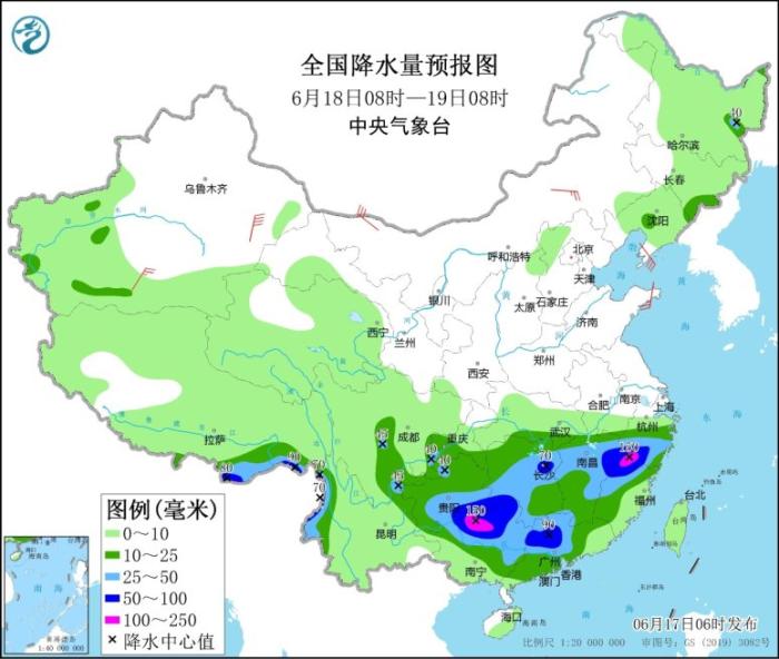 6月17日08時至18日08時,廣東大部、廣西北部和中東部、福建西部和北部、貴州南部和東部、湖南西部和南部、江西中南部、浙江南部以及云南西北部、西藏東南部等地的部分地區(qū)有大到暴雨,局地大暴雨(100~180毫米)。新疆沿天山地區(qū)和南疆盆地、內蒙古中西部、西藏中西部等地的部分地區(qū)有4~6級風,其中新疆東部部分地區(qū)風力可達7級以上;東海南部、臺灣以東洋面、北部灣將有5~6級、陣風7級的偏南到西南風。