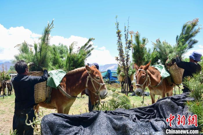 圖為拉薩南北山綠化工程,工人用騾子搬運(yùn)樹苗 貢嘎來松 攝