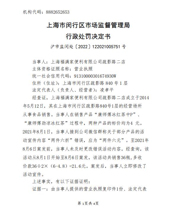 因賣(mài)冰紅茶多收錢(qián) 一福滿(mǎn)家便利店被罰64.8元