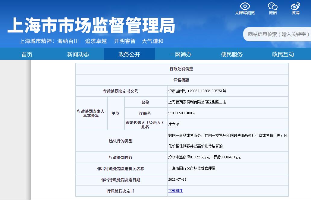 中新網(wǎng)7月27日電 上海市市場(chǎng)監(jiān)督管理局網(wǎng)站顯示,近日,上海福滿(mǎn)家便利有限公司疏影路二店,因?qū)ν簧唐坊蛘叻?wù),在同一交易場(chǎng)所同時(shí)使用兩種標(biāo)價(jià)簽或者價(jià)目表,以低價(jià)招徠顧客并以高價(jià)進(jìn)行結(jié)算,被上海市閔行區(qū)市場(chǎng)監(jiān)督管理局沒(méi)收違法所得21.6元、罰款64.8元。