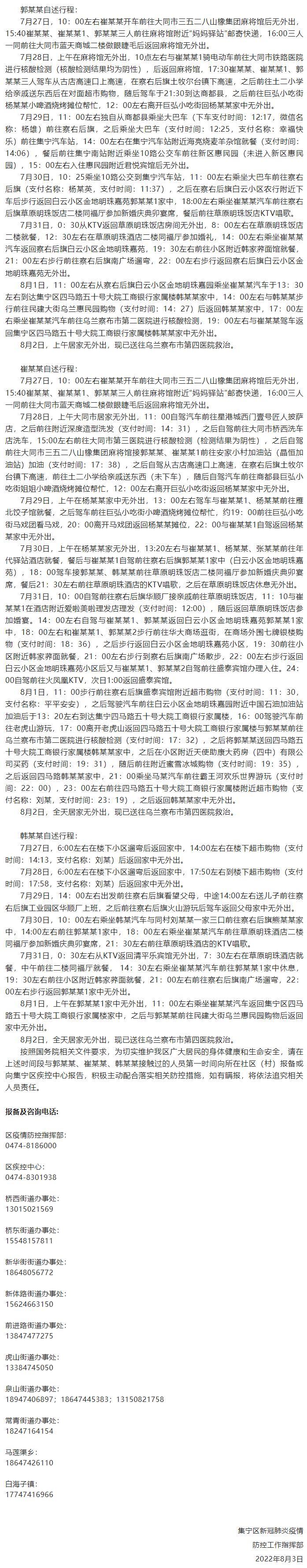 2022年8月2日,內(nèi)蒙古烏蘭察布市集寧區(qū)在居民“愿檢盡檢”中發(fā)現(xiàn)一管混檢異常樣本,隨即對所有混檢人員進(jìn)行單采單檢,其中大同市前來集寧區(qū)人員郭某某為初篩陽性,同時(shí)對郭某某同行同住人員進(jìn)行核酸檢測,同行同住人員崔某某、韓某某為初篩陽性,目前此3例初篩陽性人員均已轉(zhuǎn)運(yùn)至定點(diǎn)救治醫(yī)院,現(xiàn)將3人的行程軌跡公布如下: