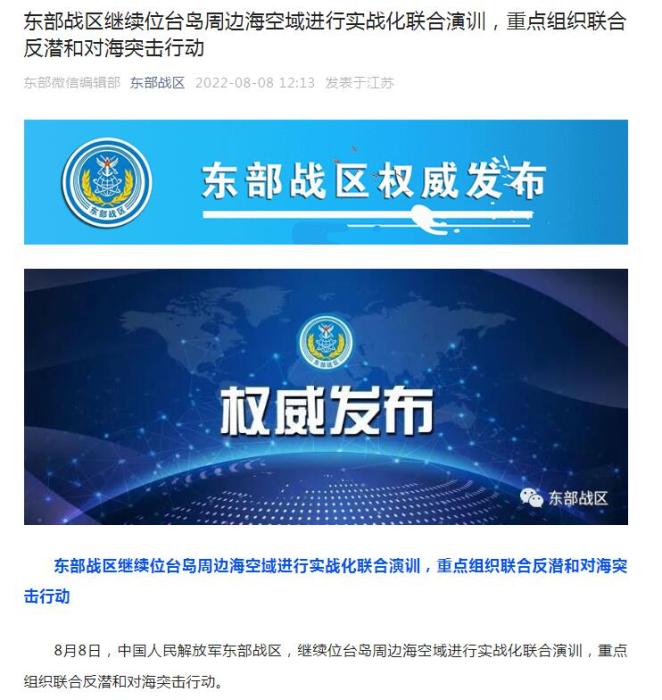 中新網(wǎng)8月8日電 據(jù)東部戰(zhàn)區(qū)微信公眾號消息,8月8日,中國人民解放軍東部戰(zhàn)區(qū)繼續(xù)位臺島周邊海空域進行實戰(zhàn)化聯(lián)合演訓,重點組織聯(lián)合反潛和對海突擊行動。