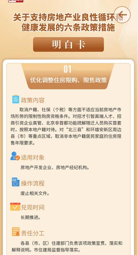根據(jù)政策明白卡,廊坊優(yōu)化調(diào)整住房限購(gòu)、限售政策。取消戶籍、社保(個(gè)稅)等方面不適應(yīng)當(dāng)前房地產(chǎn)市場(chǎng)形勢(shì)的限制性購(gòu)房資格條件。對(duì)招才引智高端人才、招商引資企業(yè)高管、北京非首都功能疏解隨遷人員購(gòu)買(mǎi)首套時(shí),按照本地戶籍對(duì)待。對(duì)“北三縣”和環(huán)雄安新區(qū)周邊縣(市)等重點(diǎn)區(qū)域,取消非本地戶籍居民家庭的住房限售年限要求。
