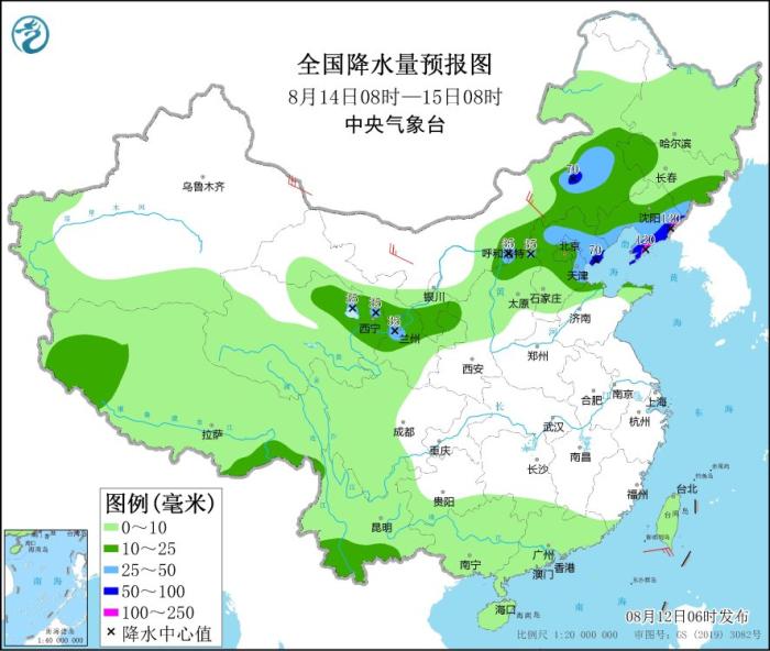 8月14日08時至15日08時,內(nèi)蒙古東部、青海東北部、甘肅南部、寧夏南部、華北中北部、山東北部、遼寧大部、吉林東南部、云南南部等地部分地區(qū)有中到大雨,其中,遼寧東部和南部、河北東北部等地部分地區(qū)有暴雨,局地大暴雨(100~120毫米)。內(nèi)蒙古中西部、新疆東部等地部分地區(qū)有4~6級風。