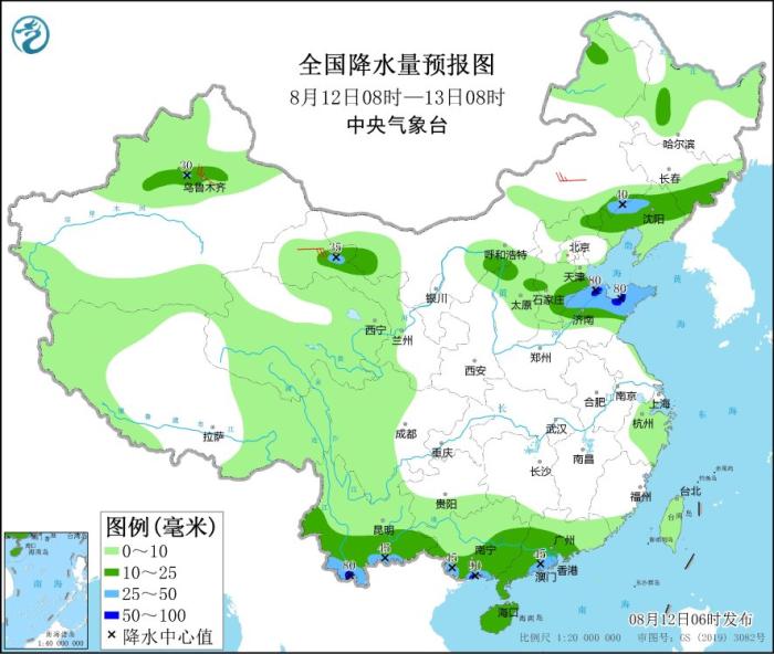 8月12日08時至13日08時,內(nèi)蒙古東南部、吉林東部、遼寧北部、新疆沿天山地區(qū)、甘肅河西、陜西北部、河北南部、山東中北部、云南南部、華南南部和海南島等地部分地區(qū)有中到大雨,其中,山東北部、云南西南部、廣西南部沿海等地部分地區(qū)有暴雨(50~90毫米)。內(nèi)蒙古中部、甘肅河西等地部分地區(qū)有4~6級風。