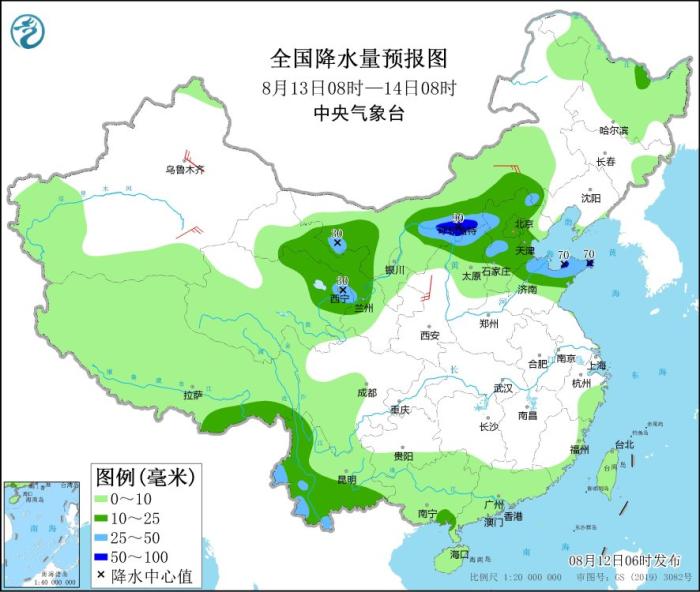 8月13日08時至14日08時,內(nèi)蒙古中西部、青海東北部、甘肅中部、華北中北部、山東中北部、云南南部等地部分地區(qū)有中到大雨,其中,內(nèi)蒙古中部、山東半島北部等地部分地區(qū)有暴雨(50~90毫米)。內(nèi)蒙古中部、新疆沿天山地區(qū)和南疆盆地等地部分地區(qū)有4~6級風。