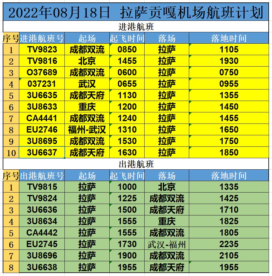因公共安全原因,8月18日,拉薩貢嘎機(jī)場部分航班取消,計(jì)劃執(zhí)行進(jìn)出港航班18架次,分別為: