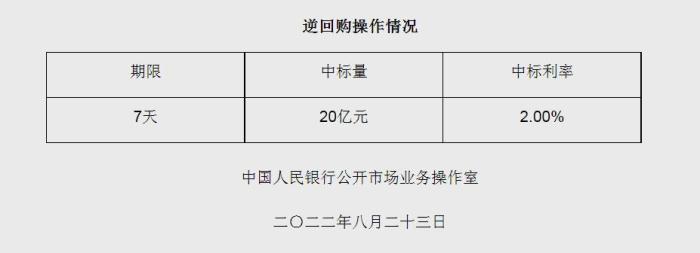 央行8月23日進行20億元7天期逆回購操作 中標(biāo)利率2.00%