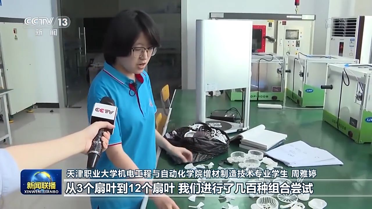 天津職業(yè)大學(xué)機(jī)電工程與自動(dòng)化學(xué)院增材制造技術(shù)專業(yè)學(xué)生 周雅婷:這些都是我們通過3D打印打印出來(lái)的,從3個(gè)扇葉到12個(gè)扇葉,我們進(jìn)行了幾百種組合嘗試。如果差0.1毫米的話,可能會(huì)導(dǎo)致風(fēng)扇卡住。