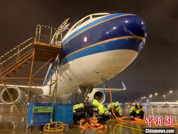 南航機(jī)務(wù)人員完成所有停場(chǎng)飛機(jī)前起落架與主起落架系留?!∧虾焦﹫D