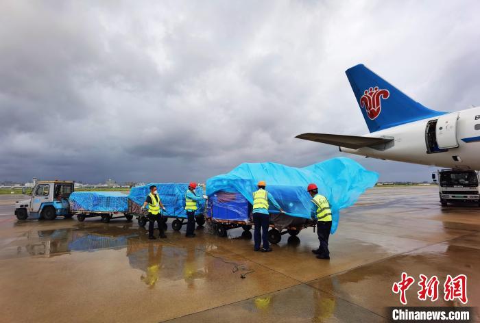 南航機(jī)務(wù)人員在臺(tái)風(fēng)來臨前及時(shí)協(xié)調(diào)現(xiàn)場(chǎng)飛機(jī)進(jìn)入具有對(duì)應(yīng)機(jī)型地錨的停機(jī)位?!∧虾焦﹫D