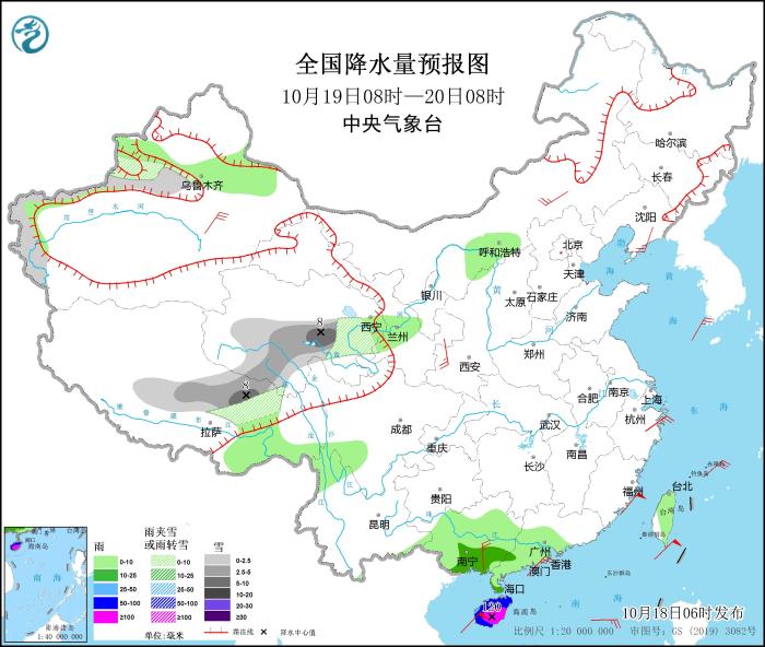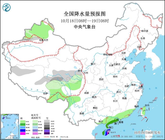 10月18日08時至19日08時,新疆沿天山地區(qū)、西藏北部和西部、青海東部和南部等地部分地區(qū)有小到中雪或雨夾雪。廣東西南部、海南島等地部分地區(qū)有中到大雨,其中,海南島中東部部分地區(qū)有暴雨或大暴雨(100~120毫米)。黑龍江東北部、廣西東南部、廣東東南部沿海等地部分地區(qū)有4~6級風(fēng);臺灣海峽、南海北部和中西部偏北海域的風(fēng)力可達(dá)10~11級、陣風(fēng)12~13級,臺風(fēng)中心經(jīng)過的附近海域風(fēng)力可達(dá)12~14級、陣風(fēng)15~16級。