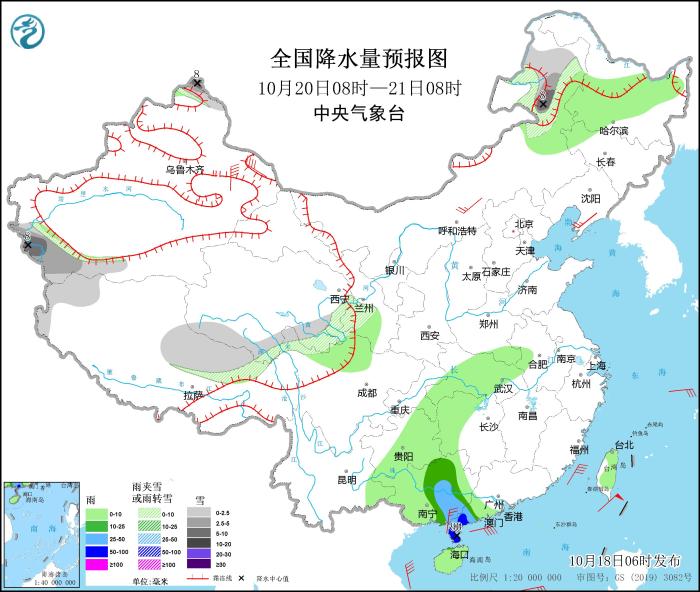 10月19日08時至20日08時,新疆沿天山地區(qū)和南疆西部山區(qū)、西藏東北部、青海中南部等地部分地區(qū)有小到中雪,其中,西藏東北部、青海東部等地部分地區(qū)有大雪(5~8毫米)。廣西南部沿海、海南島等地部分地區(qū)有中到大雨,其中,海南島等地部分地區(qū)有暴雨或大暴雨(100~120毫米)。內(nèi)蒙古東南部、遼東半島、新疆南疆盆地、陜西中部、廣西東南部等地部分地區(qū)有4~6級風(fēng);臺灣海峽、南海北部和中西部偏北海域的風(fēng)力可達(dá)10~11級、陣風(fēng)12~13級,臺風(fēng)中心經(jīng)過的附近海域風(fēng)力可達(dá)12~14級、陣風(fēng)15~16級。