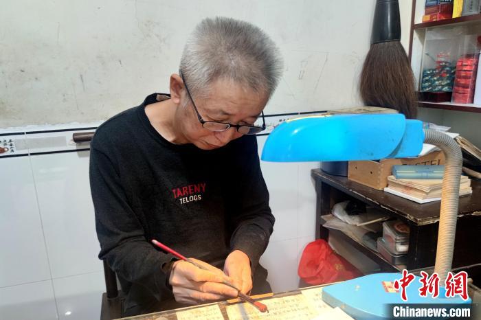 藍田張氏毛筆制作技藝非遺傳承人張才枝在為剛做好的毛筆刻字。 吳冠標 攝
