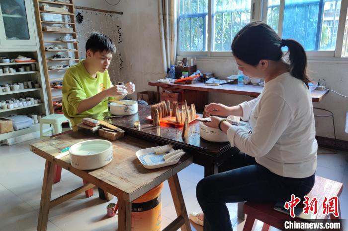 張才枝的兩個徒弟在學習制筆。 吳冠標 攝
