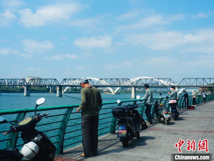 入秋,碧水藍(lán)天相互映襯,廣西柳州市的市民在柳江河的河岸上釣魚休閑?!±顙申? 攝