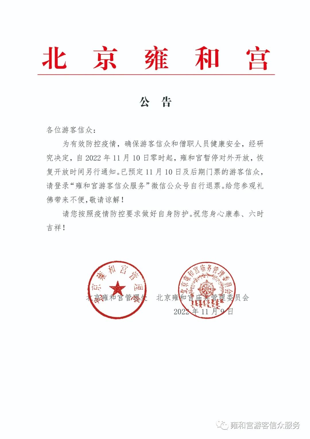中新網(wǎng)11月9日電 據(jù)雍和宮游客信眾服務(wù)微信公眾號(hào)消息,為有效防控疫情,確保游客信眾和僧職人員健康安全,經(jīng)研究決定,自2022年11月10日零時(shí)起,雍和宮暫停對(duì)外開(kāi)放,恢復(fù)開(kāi)放時(shí)間另行通知。已預(yù)定11月10日及后期門(mén)票的游客信眾,請(qǐng)登錄“雍和宮游客信眾服務(wù)”微信公眾號(hào)自行退票。