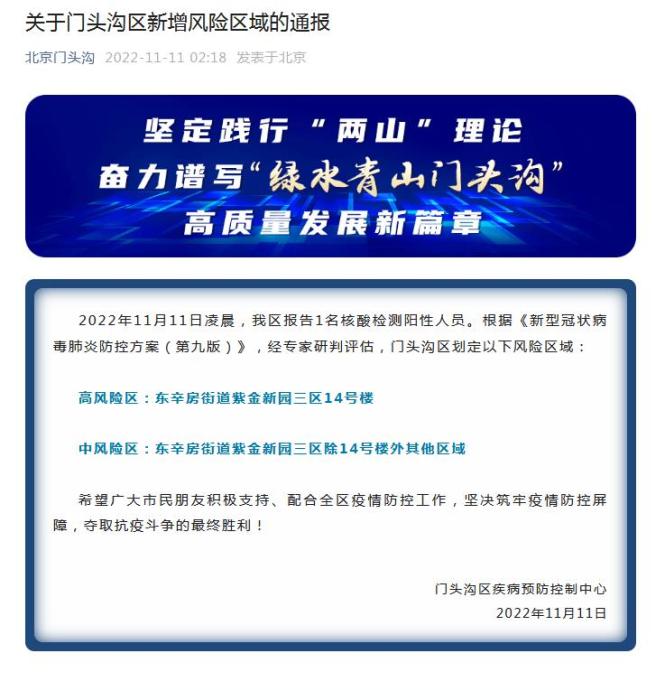 中新網(wǎng)11月11日電 據(jù)“北京門頭溝”微信公眾號(hào)消息,北京市門頭溝區(qū)疾病預(yù)防控制中心11日發(fā)布通報(bào)稱,2022年11月11日凌晨,門頭溝區(qū)報(bào)告1名核酸檢測(cè)陽性人員。根據(jù)《新型冠狀病毒肺炎防控方案(第九版)》,經(jīng)專家研判評(píng)估,門頭溝區(qū)劃定以下風(fēng)險(xiǎn)區(qū)域: