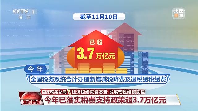 國(guó)家稅務(wù)總局今天公布最新數(shù)據(jù),截至11月10日,今年全國(guó)稅務(wù)系統(tǒng)合計(jì)辦理新增減稅降費(fèi)及退稅緩稅緩費(fèi)已超3.7萬(wàn)億元,各項(xiàng)稅費(fèi)支持政策有效減輕了企業(yè)負(fù)擔(dān),增強(qiáng)了企業(yè)發(fā)展動(dòng)能。