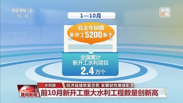 水利部今天發(fā)布數(shù)據(jù)顯示:1—10月,全國(guó)累計(jì)新開(kāi)工水利項(xiàng)目2.4萬(wàn)個(gè),較去年同期多開(kāi)工5200多個(gè),其中新開(kāi)工重大水利工程45項(xiàng),創(chuàng)歷史新高。