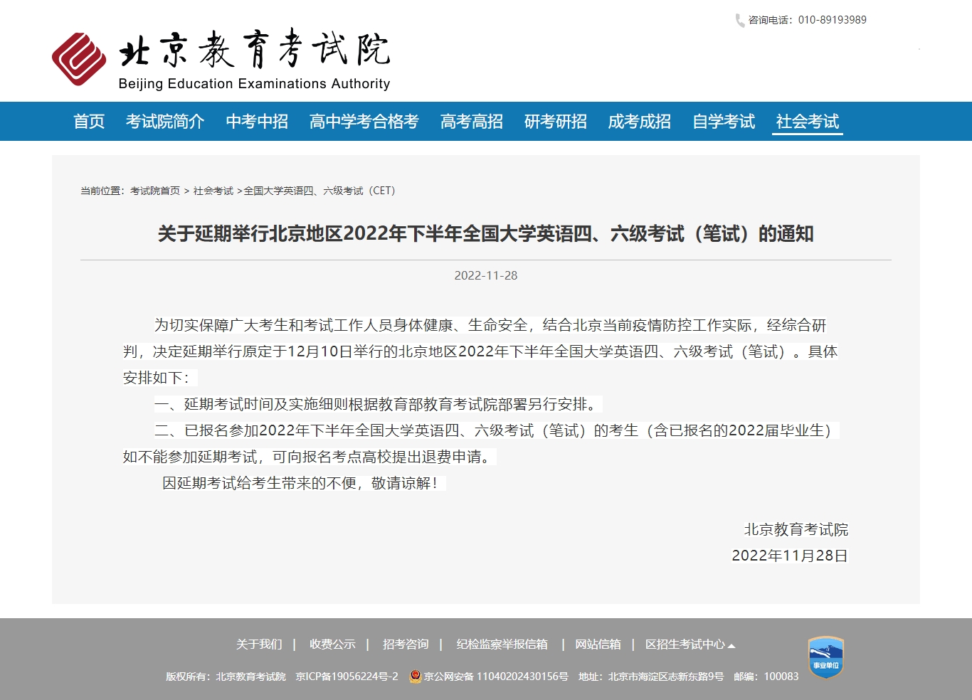 中新網(wǎng)11月28日電 據(jù)北京市教育考試院網(wǎng)站消息,北京教育考試院28日發(fā)布通知,為切實(shí)保障廣大考生和考試工作人員身體健康、生命安全,結(jié)合北京當(dāng)前疫情防控工作實(shí)際,經(jīng)綜合研判,決定延期舉行原定于12月10日舉行的北京地區(qū)2022年下半年全國(guó)大學(xué)英語(yǔ)四、六級(jí)考試(筆試)。具體安排如下: