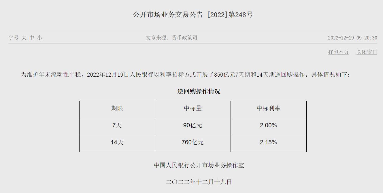 中新網(wǎng)12月19日電 據(jù)央行官網(wǎng)19日消息,為維護(hù)年末流動(dòng)性平穩(wěn),2022年12月19日人民銀行以利率招標(biāo)方式開展了850億元7天期和14天期逆回購操作。(中新財(cái)經(jīng))