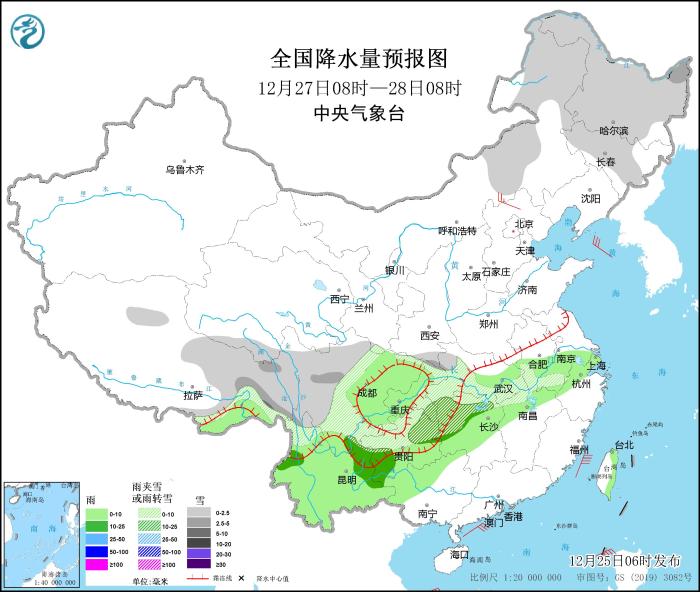 12月25日08時(shí)至26日08時(shí),西藏東部、青海東南部、川西高原北部、西北地區(qū)東南部、山西南部、黃淮西部、江漢西部等地部分地區(qū)有小到中雪或雨夾雪,其中,西藏東部、陜西中南部等地部分地區(qū)有大雪。西藏東南部、湖南西部、四川盆地中東部和西部、重慶大部、貴州大部、云南中南部等地部分地區(qū)有小雨。渤海海峽、黃海大部海域、東海大部海域、臺灣海峽、臺灣以東洋面、巴士海峽、南海大部海域?qū)⒂?~7級、陣風(fēng)8級的的西北風(fēng)到東北風(fēng),其中南海中東部部分海域風(fēng)力可達(dá)8級、陣風(fēng)9~10級。