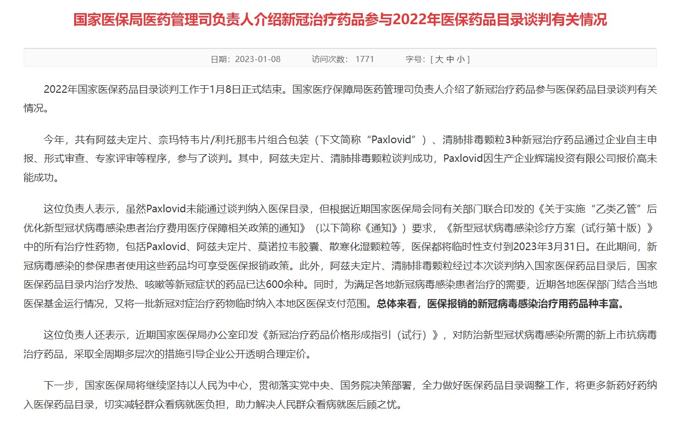 其中,阿茲夫定片、清肺排毒顆粒談判成功,Paxlovid因生產(chǎn)企業(yè)輝瑞投資有限公司報價高未能成功。