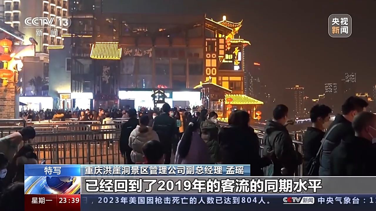 重慶洪崖洞景區(qū)管理公司副總經(jīng)理 孟瑤:本來按照我們的預(yù)估,可能會在今年的二到三月份,游客量會有一個明顯的回升。元旦的第一天和第二天,我們的客流分別已經(jīng)達(dá)到了6.4萬和6.2萬,已經(jīng)回到了2019年的客流的同期水平,甚至已經(jīng)超過了17%。