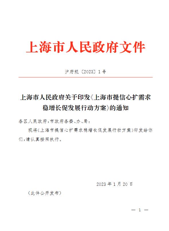 中新網(wǎng)1月29日電 據(jù)上海發(fā)布微信公眾號29日消息,為全面貫徹黨的二十大和中央經(jīng)濟(jì)工作會議精神,落實市第十二次黨代會和十二屆市委二次全會部署,抓牢高質(zhì)量發(fā)展首要任務(wù),大力提振市場預(yù)期和信心,推動經(jīng)濟(jì)社會發(fā)展開好局起好步,近期上海市制定了《上海市提信心擴(kuò)需求穩(wěn)增長促發(fā)展行動方案》(以下簡稱《行動方案》)。