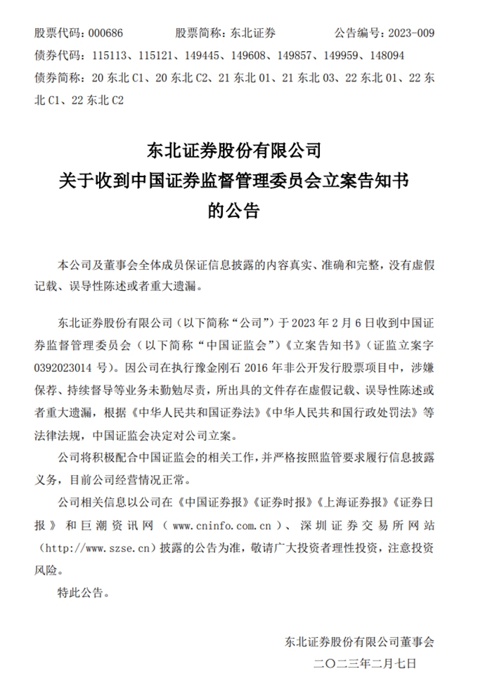 中新網(wǎng)2月7日電 7日,東北證券發(fā)公告稱,東北證券股份有限公司于2023年2月6日收到中國證券監(jiān)督管理委員會(huì)《立案告知書》(證監(jiān)立案字 0392023014 號(hào))。因公司在執(zhí)行豫金剛石2016年非公開發(fā)行股票項(xiàng)目中,涉嫌保薦、持續(xù)督導(dǎo)等業(yè)務(wù)未勤勉盡責(zé),所出具的文件存在虛假記載、誤導(dǎo)性陳述或者重大遺漏,根據(jù)相關(guān)法律法規(guī),中國證監(jiān)會(huì)決定對(duì)公司立案。(中新財(cái)經(jīng))