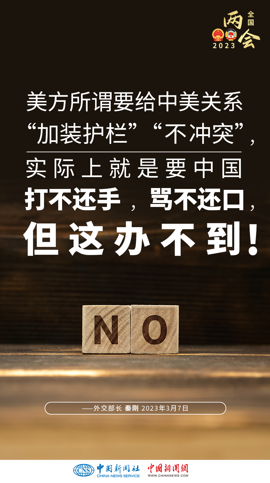 秦剛:美方聲稱要“競贏”中國但不尋求沖突。但實(shí)際上,美方的所謂“競爭”,就是全方位遏制打壓,就是你死我活的零和博弈。美方口口聲聲說要遵守規(guī)則,但如同兩位運(yùn)動(dòng)員在奧運(yùn)田徑場上賽跑,一方不是想著如何跑出自己的最好成績,而總是要去絆倒對方,甚至想讓對方參加殘奧會(huì),這不是公平競爭,而是惡意對抗,犯規(guī)了!美方所謂要給中美關(guān)系“加裝護(hù)欄”“不沖突”,實(shí)際上就是要中國打不還手,罵不還口,但這辦不到!