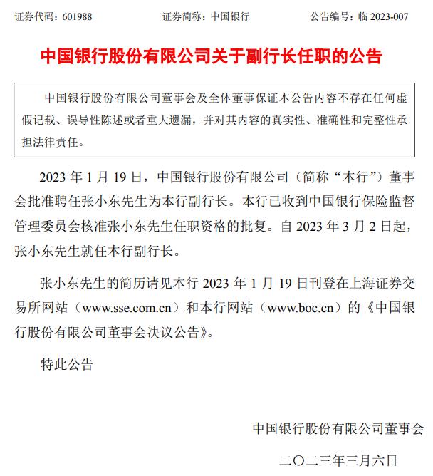 中國銀行6日發(fā)布的公告顯示,2023年1月19日,中國銀行董事會批準(zhǔn)聘任張小東為該行副行長。該行已收到銀保監(jiān)會核準(zhǔn)張小東任職資格的批復(fù)。自2023年3月2日起,張小東就任中國銀行副行長。