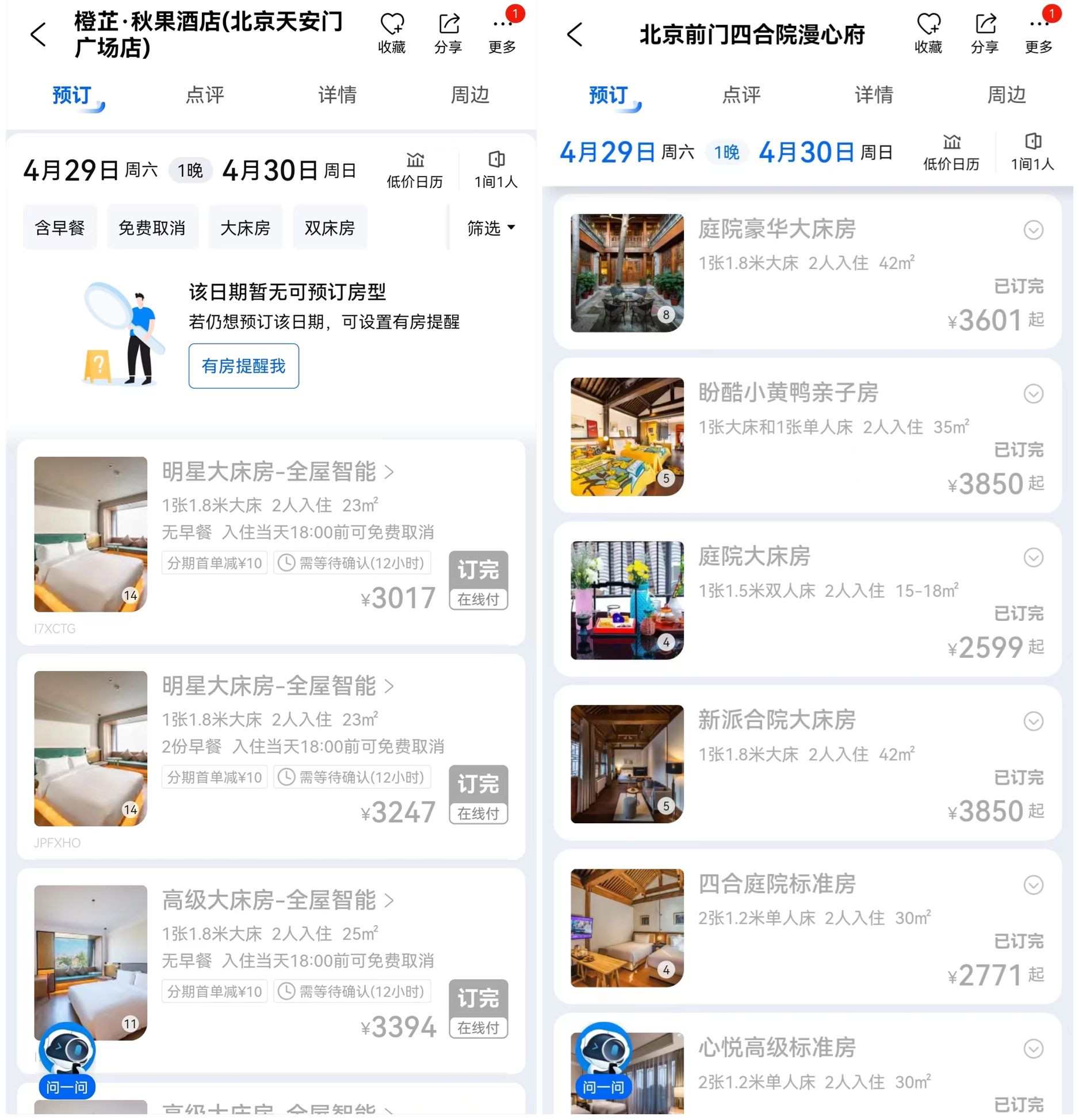 北京天安門附近有酒店已顯示滿房,或多個(gè)房型訂滿。截圖來源:攜程旅行App