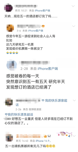 社交平臺(tái)上,多名網(wǎng)友早已規(guī)劃好了自己“五一”出行的計(jì)劃,并已提前購(gòu)買機(jī)票和酒店,面對(duì)緊俏的旅游產(chǎn)品,有網(wǎng)友驚呼:“現(xiàn)在就已經(jīng)訂不到房了嗎?”“低價(jià)機(jī)票隔一會(huì)兒就沒了!”