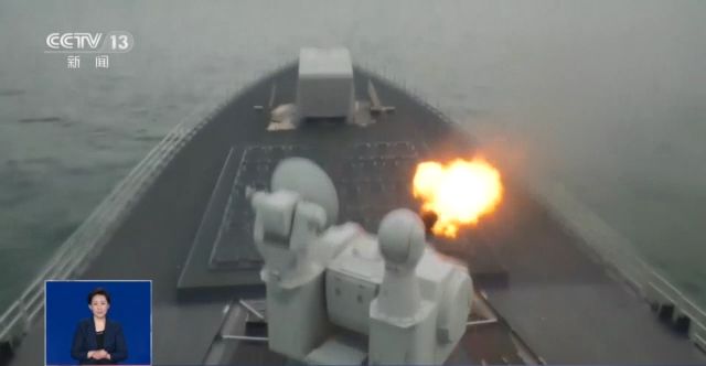 剛剛到達(dá)預(yù)定海域,無錫艦雷達(dá)就發(fā)現(xiàn)海上目標(biāo),官兵立即進入戰(zhàn)斗狀態(tài)。鎖定目標(biāo)后,無錫艦主炮連續(xù)開火成功摧毀海上目標(biāo)。此時,雷達(dá)發(fā)現(xiàn)空中目標(biāo)來襲。雷達(dá)鎖定目標(biāo)后,副炮迅速對空中目標(biāo)進行打擊。同時,無錫艦連續(xù)發(fā)射多枚干擾彈,并快速機動規(guī)避。