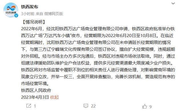 中新網(wǎng)4月3日電 鐵西發(fā)布官方微博3日發(fā)布情況說明:2022年6月,經(jīng)沈陽鐵西萬達(dá)廣場商業(yè)管理有限公司申請,鐵西區(qū)政府批準(zhǔn)舉辦鐵西萬達(dá)廣場“萬達(dá)汽車小鎮(zhèn)”夜市,經(jīng)營期限為2022年6月20日至10月8日。在臨近經(jīng)營期滿時,沈陽鐵西萬達(dá)廣場商業(yè)管理有限公司在未申請延長經(jīng)營期限的情況下,與第三方遼寧峰瑞文化傳媒有限公司簽訂協(xié)議,擅自擴大經(jīng)營規(guī)模,違規(guī)超期對外招租。