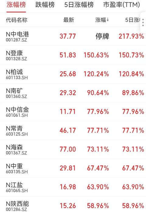 截至發(fā)稿時(shí),N中電港停牌,N登康漲幅150.63%,N柏誠漲幅120.24%、N南礦漲幅90.64%,N中信金、N常青、N海森、N中重、N江鹽、N陜西能保持強(qiáng)勢上漲。