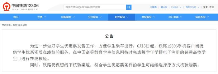 12306手機(jī)客戶端5日起提供學(xué)生優(yōu)惠資質(zhì)在線核驗服務(wù)