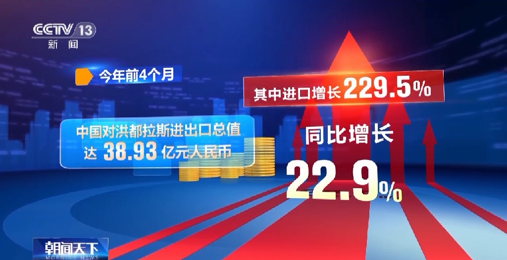 據(jù)統(tǒng)計(jì),今年前4個(gè)月,中國對(duì)洪都拉斯進(jìn)出口總值達(dá)38.93億元人民幣,同比增長22.9%,其中進(jìn)口增長229.5%。(央視新聞客戶端)