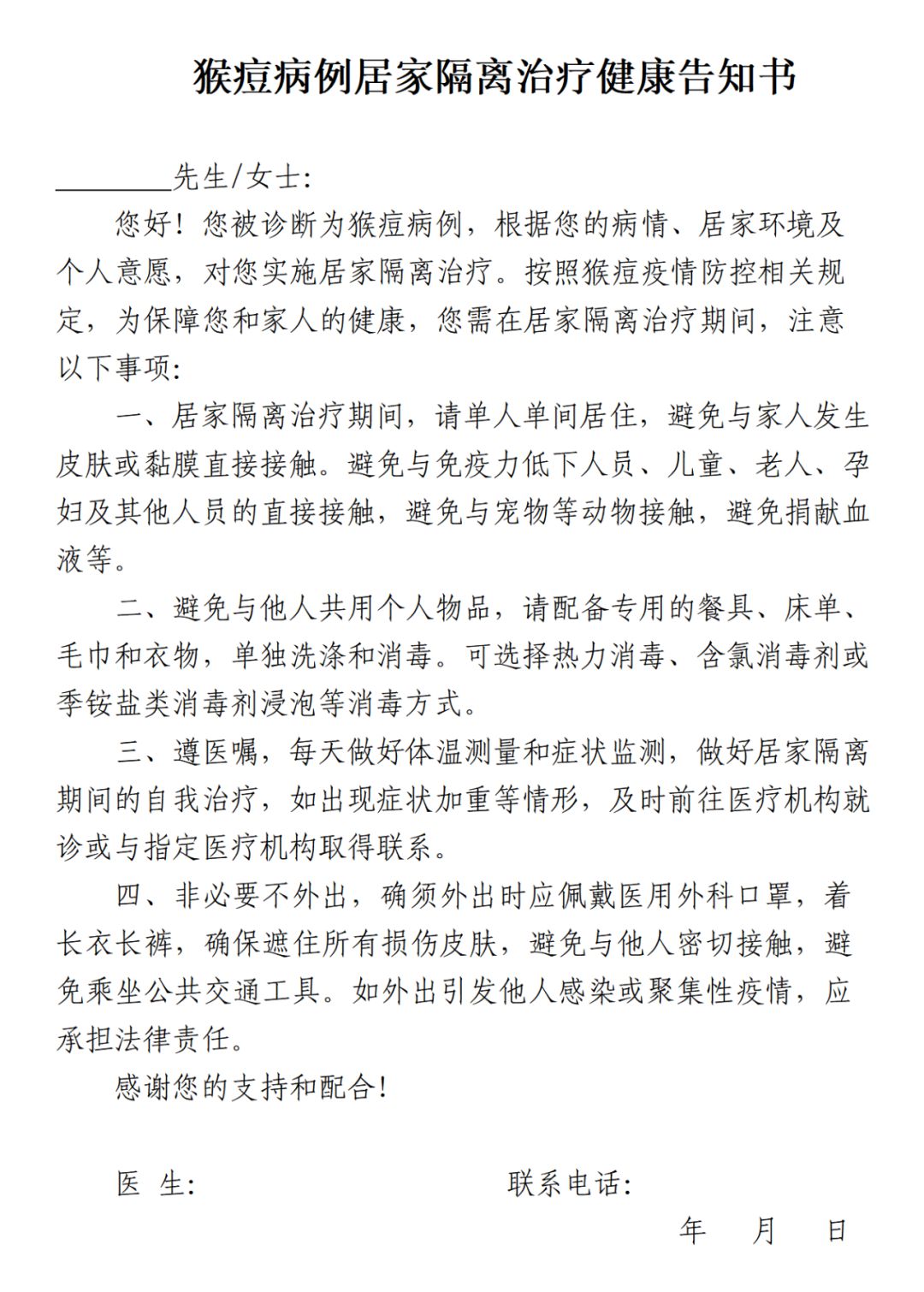 各地發(fā)現(xiàn)猴痘疑似病例和確診病例應(yīng)當(dāng)及時轉(zhuǎn)運至醫(yī)療機構(gòu)進行隔離治療,如臨床癥狀明顯好轉(zhuǎn),病變部位已結(jié)痂,可轉(zhuǎn)為居家隔離治療,直至皮疹結(jié)痂自然脫落,解除居家隔離。對病情較輕且具備居家隔離治療條件的確診病例,經(jīng)醫(yī)療機構(gòu)與疾控機構(gòu)聯(lián)合評估后,可直接采取居家隔離治療。對于實行居家隔離治療的確診病例發(fā)放《猴痘病例居家隔離治療健康告知書》(見附件2)。確診病例居家隔離治療期間,單人單間居住,避免與家人有皮膚或黏膜直接接觸,做好被污染物品的消毒,非必要不外出,確須外出時穿長衣長褲、佩戴醫(yī)用外科口罩,避免前往人群聚集場所,避免與其他人有皮膚或黏膜直接接觸;指定醫(yī)療機構(gòu)安排專人負責(zé)上門或電話隨訪,提供健康咨詢和醫(yī)療指導(dǎo)。