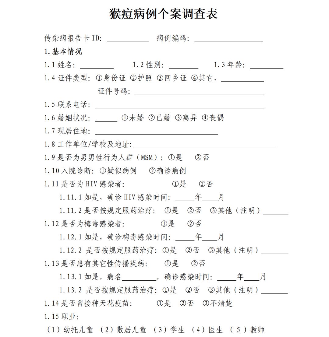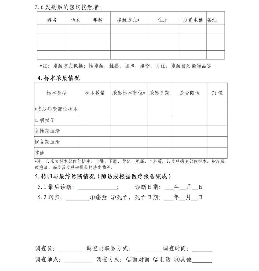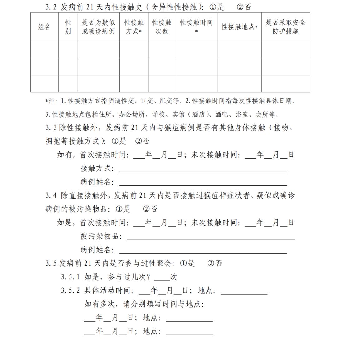 開展個案調(diào)查時,要認真、詳細了解和記錄病例基本信息、發(fā)病就診情況、臨床表現(xiàn)、轉(zhuǎn)歸及實驗室檢測信息;發(fā)病前21天內(nèi)與可疑感染來源的接觸史、接觸場所及接觸方式;發(fā)病后至隔離治療前的具體活動地點、與其有皮膚或黏膜直接接觸者,以及發(fā)病前4天內(nèi)與其有性接觸者。