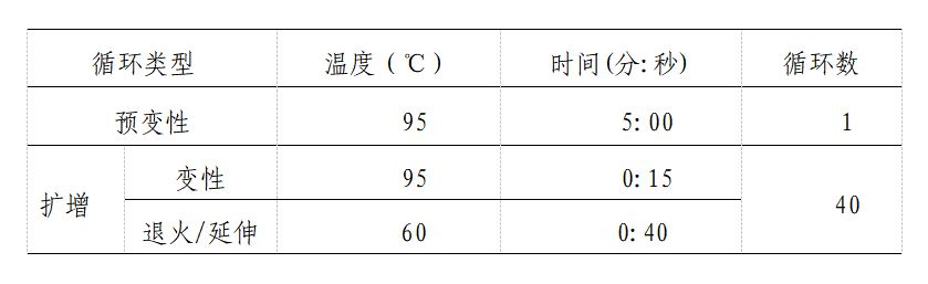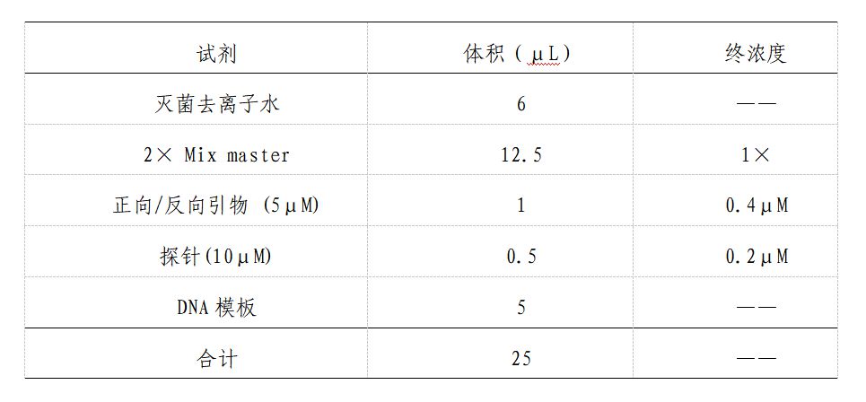 ?、軆x器檢測通道選擇:使用熒光定量PCR檢測儀,選擇Fam熒光信號檢測通道,收集設(shè)在60℃。具體設(shè)置方法參照各儀器使用說明書。