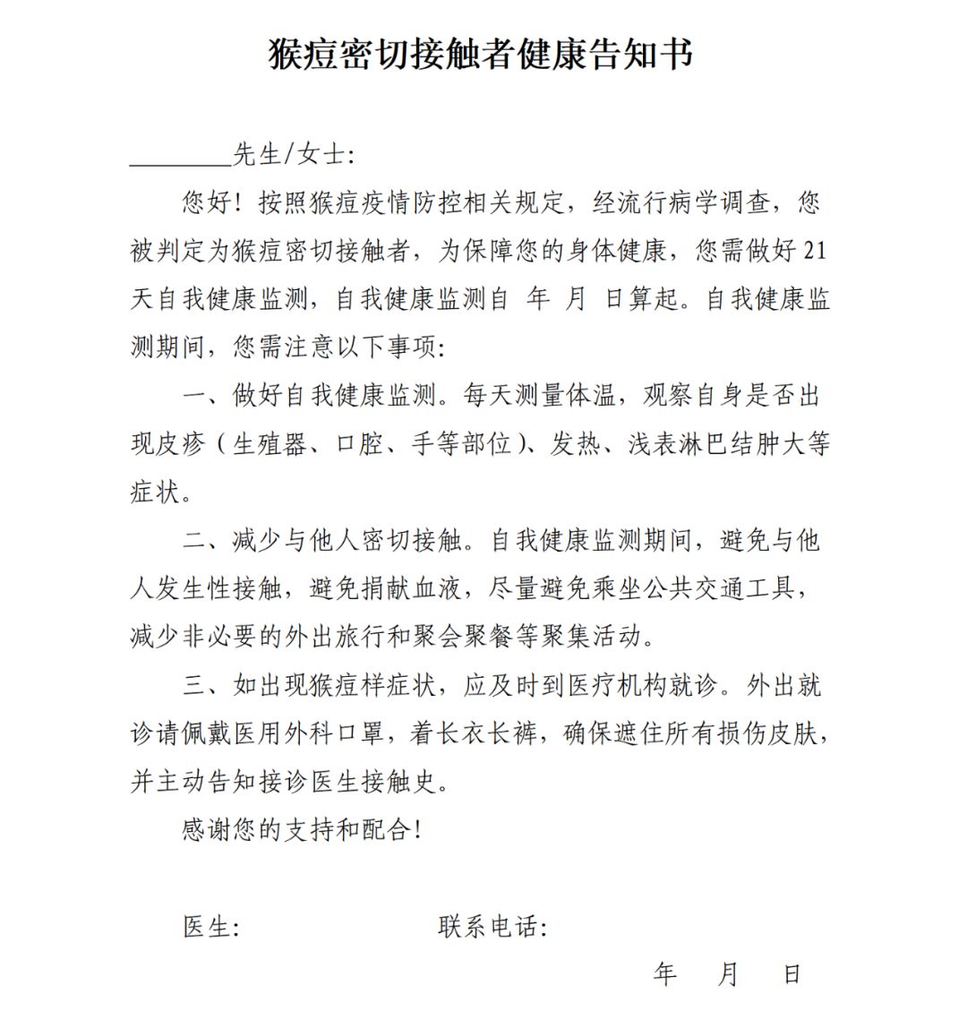 密切接觸者自我健康監(jiān)測期間可正常生活與工作,需避免與他人發(fā)生性接觸等密切接觸,避免捐獻血液等;堅持每天做好體溫測量和癥狀監(jiān)測,出現(xiàn)猴痘樣癥狀應(yīng)及時就診并主動報告可疑接觸史。轄區(qū)疾控機構(gòu)或基層醫(yī)療衛(wèi)生機構(gòu)應(yīng)在密切接觸者自我健康監(jiān)測第7、14、21天上門或電話對其進行隨訪,提供咨詢指導(dǎo),發(fā)現(xiàn)異常情況及時進行處置。