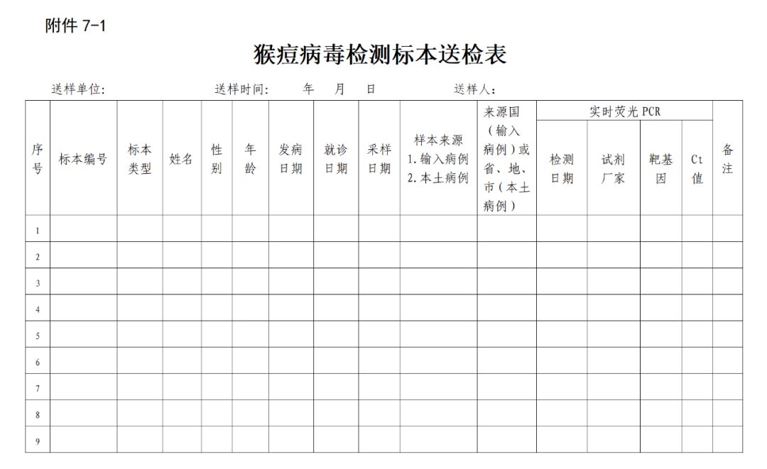 1.送檢標本:病例標本先由省級及以下疾控機構(gòu)進行初步檢測,各省首例猴痘陽性標本應(yīng)送中國疾控中心病毒病所復(fù)核。每個陽性病例至少采集一套標本(皮膚或黏膜病變部位標本、口咽拭子標本及急性期、恢復(fù)期雙份血清標本)送中國疾控中心病毒病所檢測。各省級疾控機構(gòu)根據(jù)實際情況制定省內(nèi)樣本送檢、復(fù)核流程。