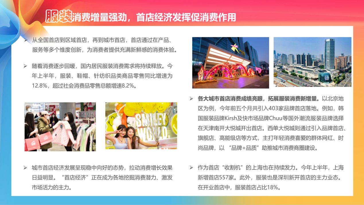 在服裝消費方面,隨著消費逐步回暖,國內居民服裝消費需求將持續(xù)釋放。以北京地區(qū)為例,今年前五個月共引入403家品牌首店落地。例如,韓國服裝品牌Kirsh及快市場品牌Chuu等國外潮流服裝品牌選擇在天津南開大悅城開出首店。西單大悅城則通過引入品牌首店、旗艦店、高能級店等方式,主打年輕消費喜愛的群體網紅、時尚品牌,以“品牌+品質”助推城市消費商圈建設?!秷蟾妗氛J為,“首店經濟”正在成為各地挖掘消費潛力、激發(fā)市場活力的主力。