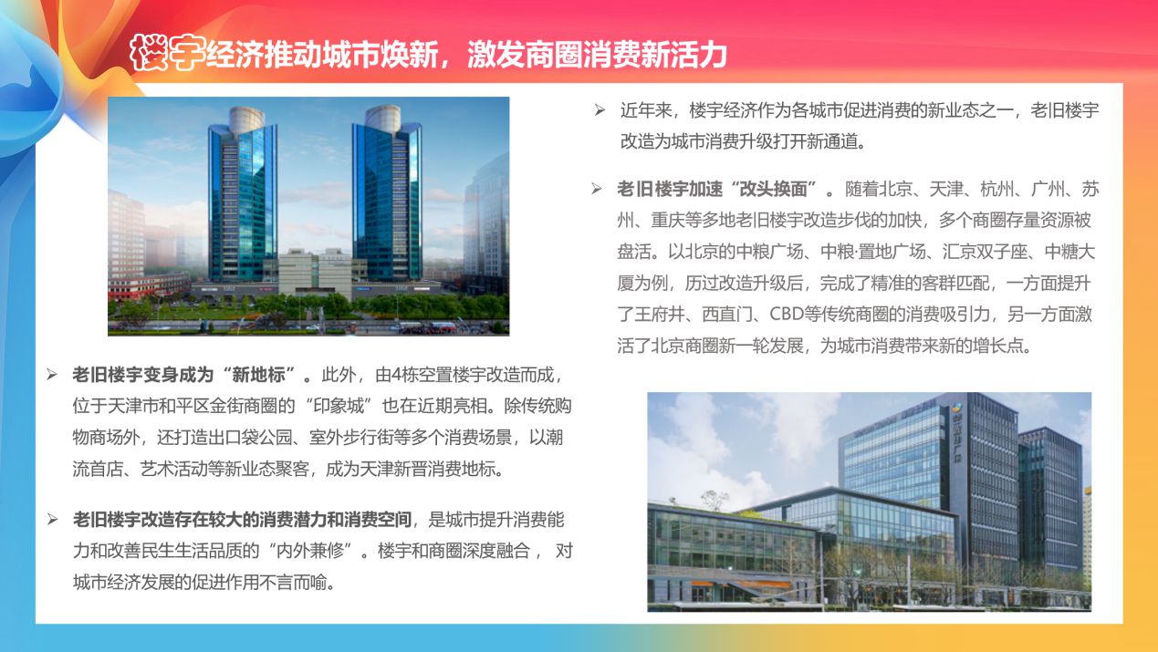 老舊樓宇改造存在較大的消費潛力和消費空間,是城市提升消費能力和改善民生生活品質的“內外兼修”?!秷蟾妗肥崂碇赋觯S著北京、天津、杭州、廣州、蘇州、重慶等多地老舊樓宇改造步伐的加快,多個商圈存量資源被盤活。以北京的中糧廣場、中糧·置地廣場、匯京雙子座、中糖大廈為例,通過舊改提升、輕(中)資產輸出等方式,打造高端商務地標,完成了精準的客群匹配,一方面提升了王府井、西直門、CBD等傳統(tǒng)商圈的消費吸引力,另一方面激活了北京商圈新一輪發(fā)展,推動片區(qū)重構和能級提升,為城市消費帶來新的增長點。